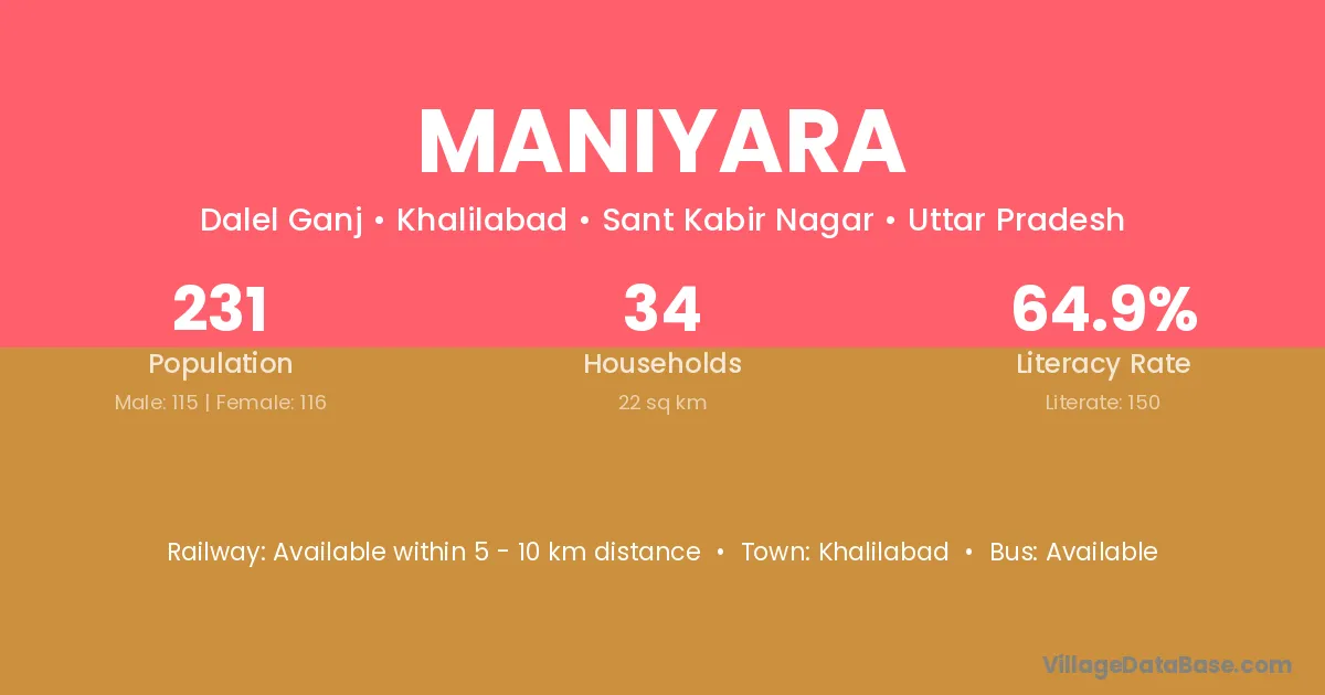 Maniyara village has a total population of 231 people, of which 115 are males and 116 are females.
