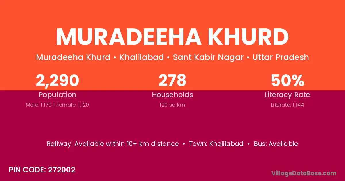 Muradeeha Khurd village has a total population of 2,290 people, of which 1,170 are males and 1,120 are females.