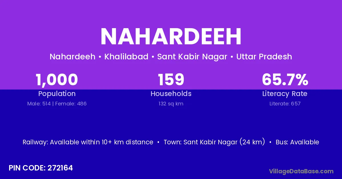 Sant Kabir Nagar (24 km) is the nearest town to Nahardeeh village for major economic activities and is located approximately 24 km away.