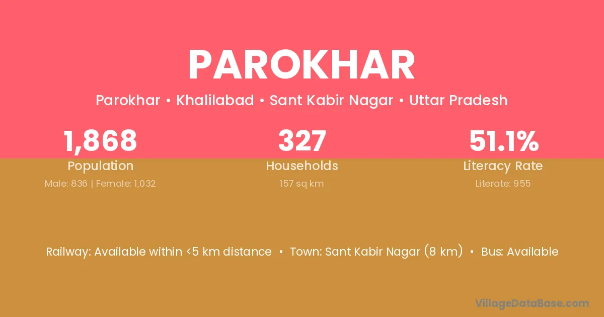 Sant Kabir Nagar (8 km) is the nearest town to Parokhar village for major economic activities and is located approximately 8 km away.