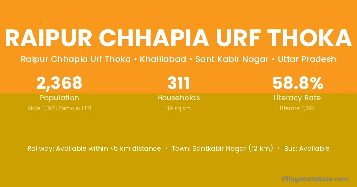 Raipur Chhapia Urf Thoka village has a total population of 2,368 people, of which 1,197 are males and 1,171 are females.
