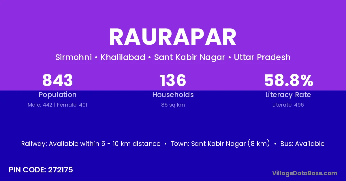Sant Kabir Nagar (8 km) is the nearest town to Raurapar village for major economic activities and is located approximately 8 km away.