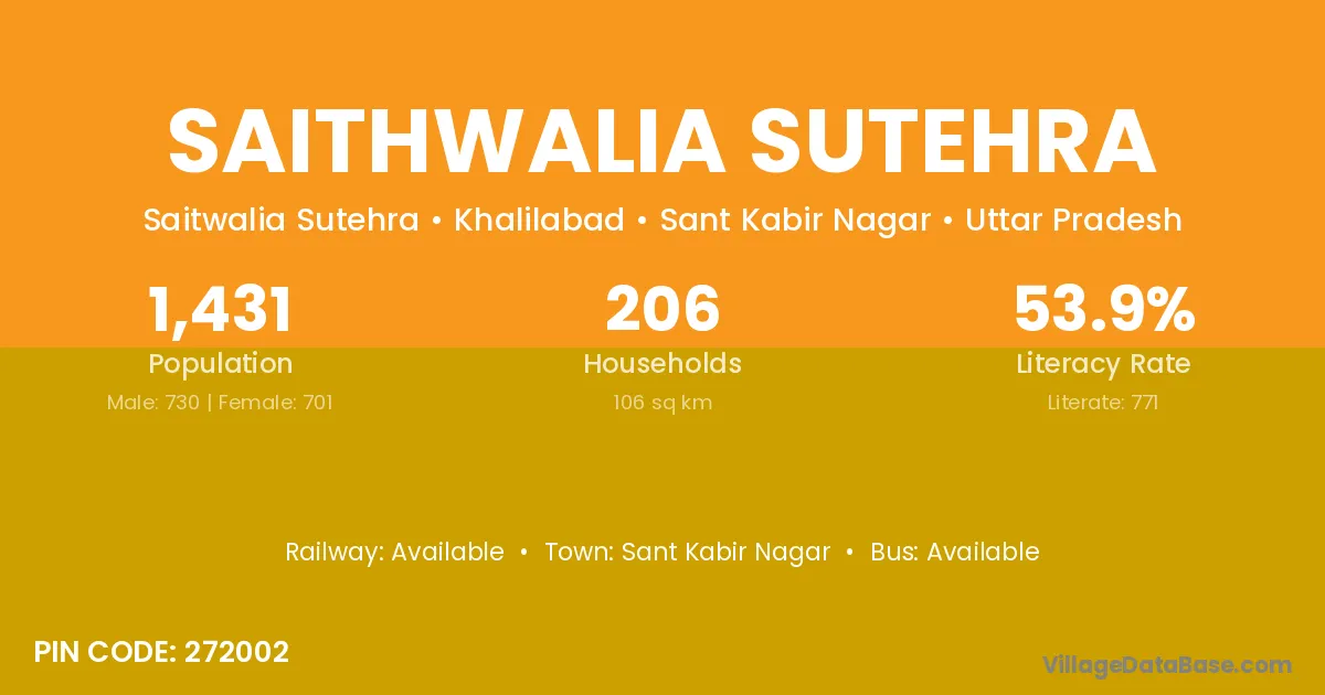 Saithwalia Sutehra village has a total population of 1,431 people, of which 730 are males and 701 are females.