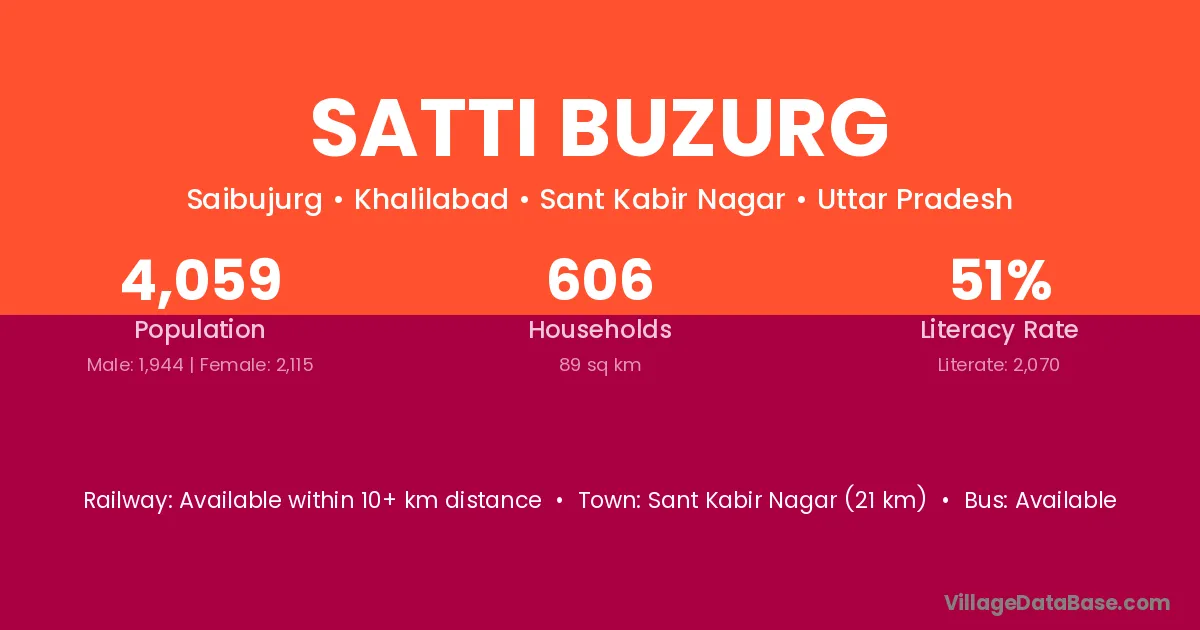 Sant Kabir Nagar (21 km) is the nearest town to Satti Buzurg village for major economic activities and is located approximately 21 km away.