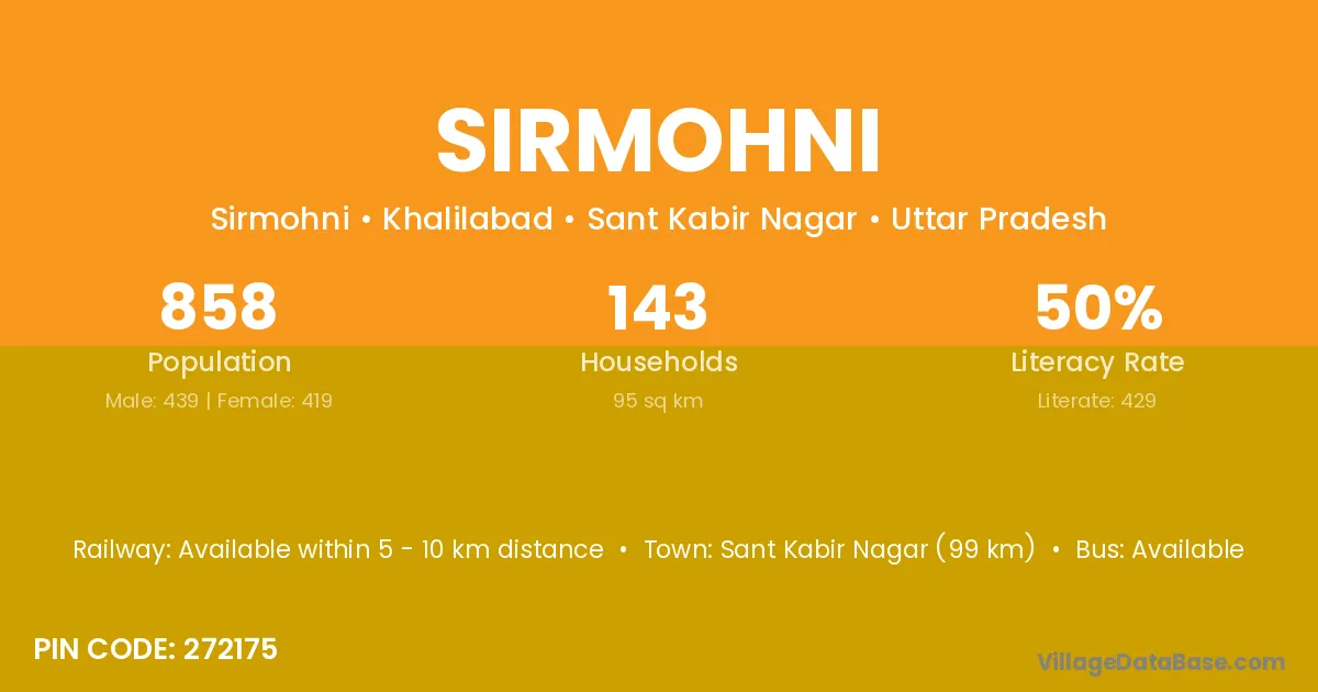 Sant Kabir Nagar (99 km) is the nearest town to Sirmohni village for major economic activities and is located approximately 99 km away.