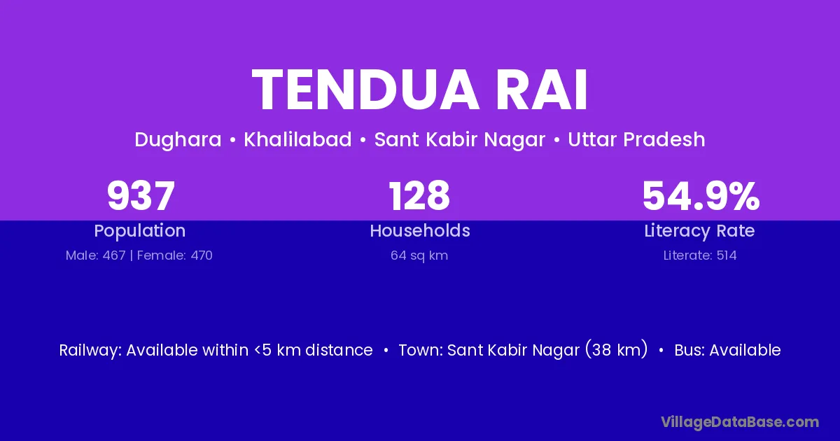 Sant Kabir Nagar (38 km) is the nearest town to Tendua Rai village for major economic activities and is located approximately 38 km away.