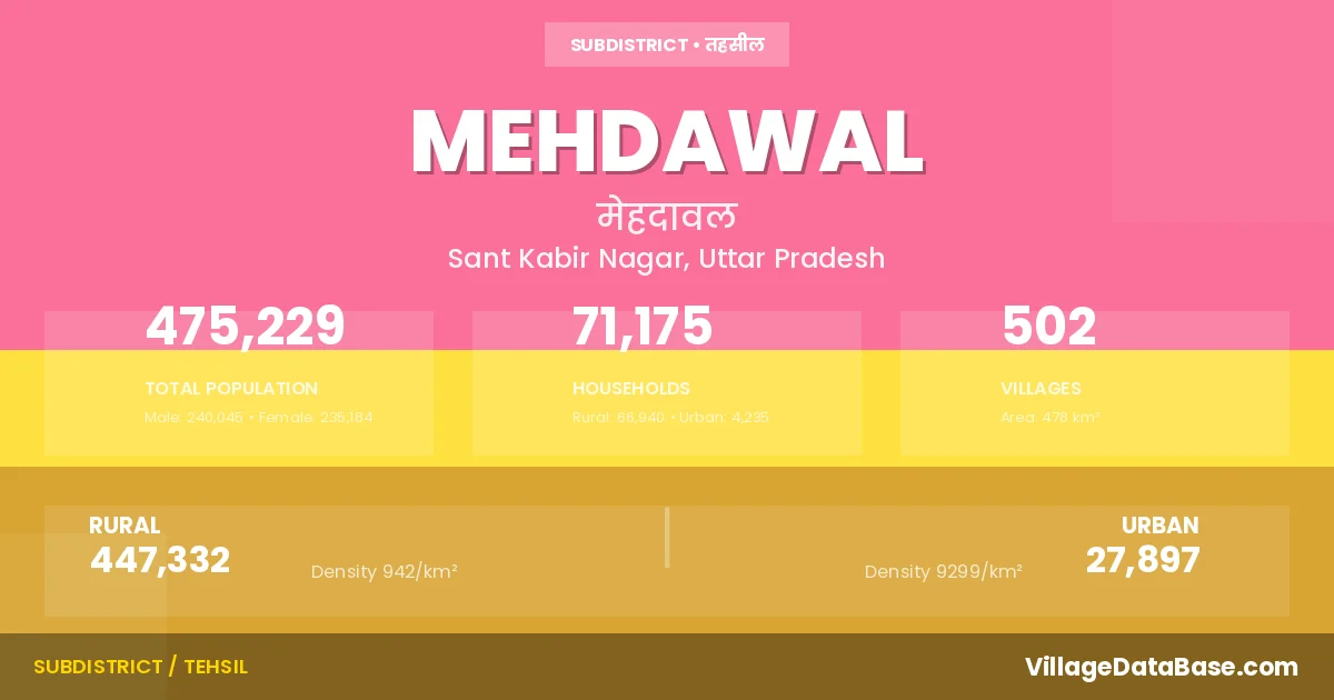 According to the 2011 census The total area of Mehdawal Tehsil is 478 km², with a population of 475229 people. The population density is 994 inhabitants per square kilometre, and there are approximately 71175 houses in the sub district.