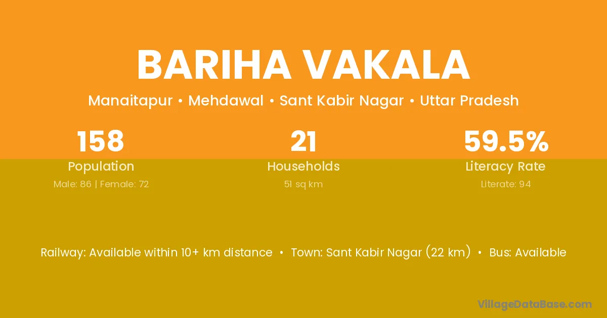 Sant Kabir Nagar (22 km) is the nearest town to Bariha Vakala village for major economic activities and is located approximately 22 km away.