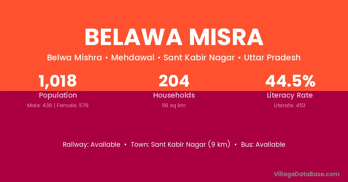 Sant Kabir Nagar (9 km) is the nearest town to Belawa Misra village for major economic activities and is located approximately 9 km away.