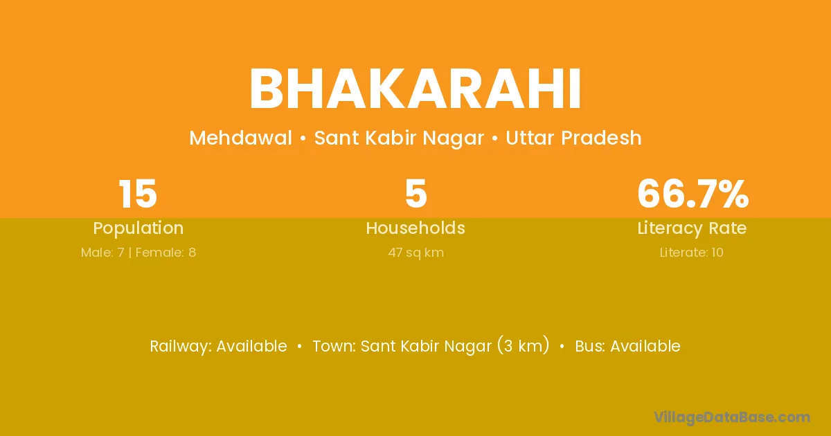 Sant Kabir Nagar (3 km) is the nearest town to Bhakarahi village for major economic activities and is located approximately 3 km away.