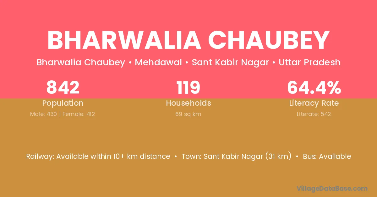 Sant Kabir Nagar (31 km) is the nearest town to Bharwalia Chaubey village for major economic activities and is located approximately 31 km away.