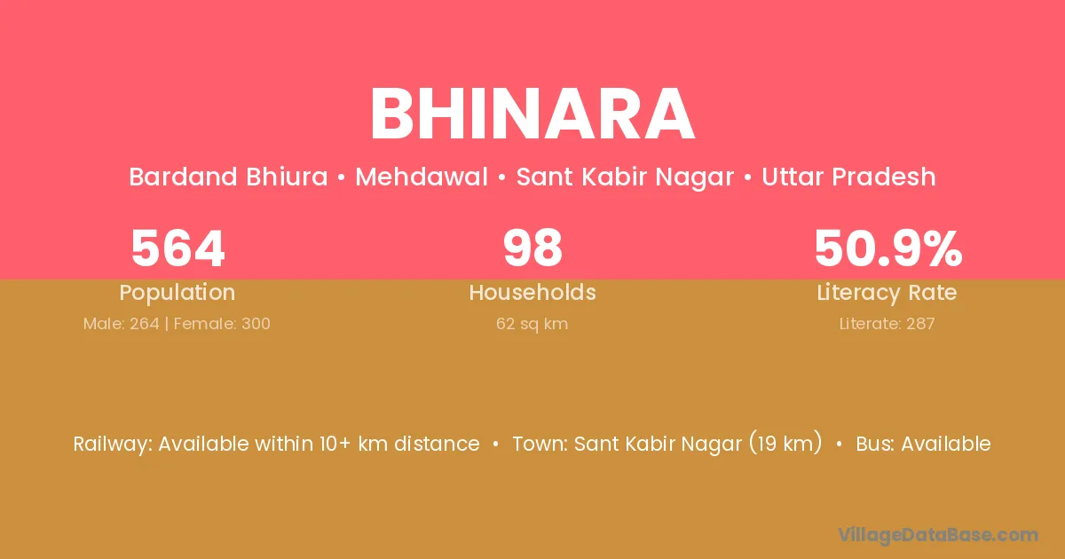Sant Kabir Nagar (19 km) is the nearest town to Bhinara village for major economic activities and is located approximately 19 km away.