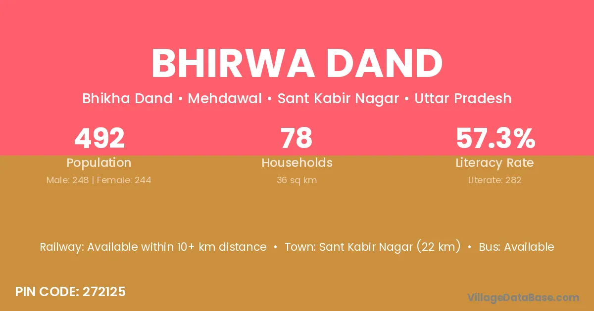Sant Kabir Nagar (22 km) is the nearest town to Bhirwa Dand village for major economic activities and is located approximately 22 km away.