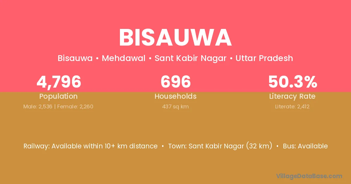 Sant Kabir Nagar (32 km) is the nearest town to Bisauwa village for major economic activities and is located approximately 32 km away.