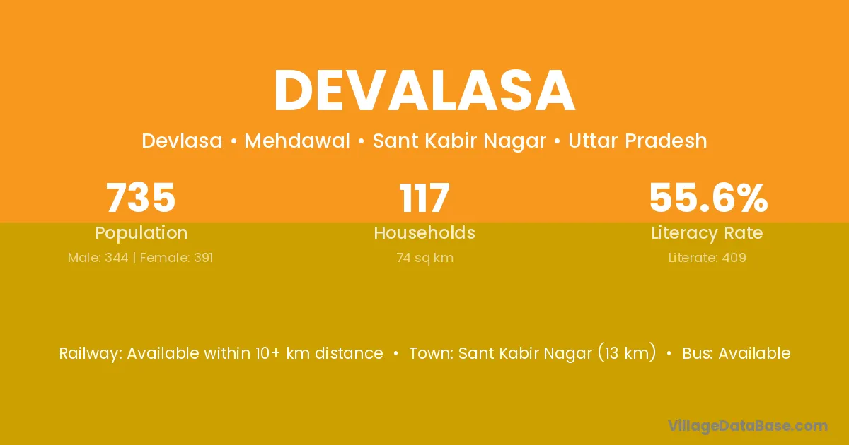 Sant Kabir Nagar (13 km) is the nearest town to Devalasa village for major economic activities and is located approximately 13 km away.