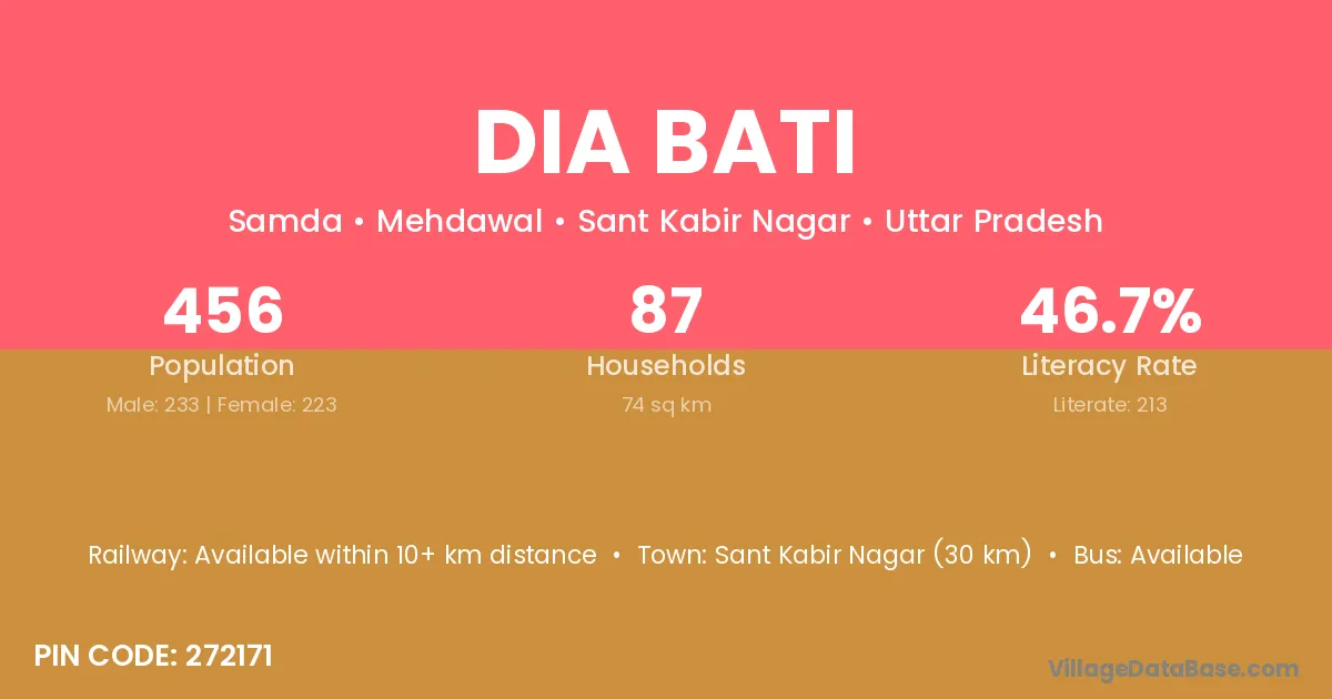 Sant Kabir Nagar (30 km) is the nearest town to Dia Bati village for major economic activities and is located approximately 30 km away.