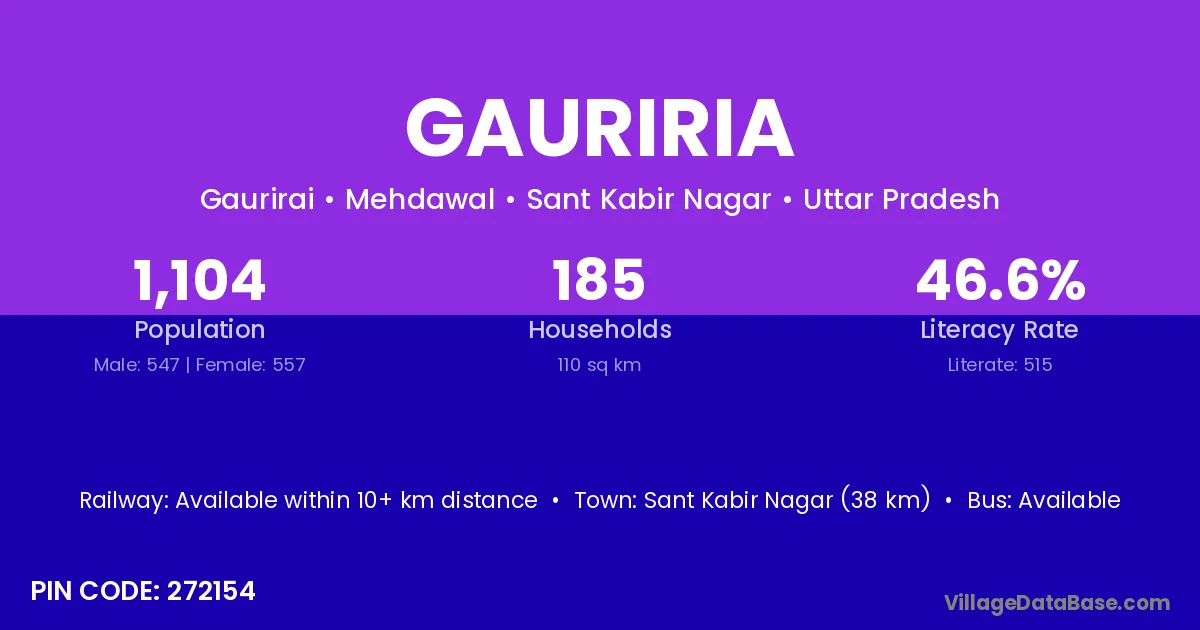 Sant Kabir Nagar (38 km) is the nearest town to Gauriria village for major economic activities and is located approximately 38 km away.