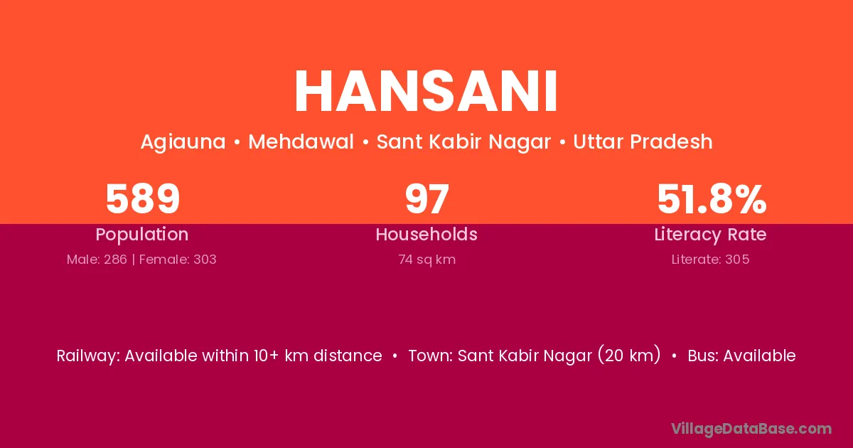 Sant Kabir Nagar (20 km) is the nearest town to Hansani village for major economic activities and is located approximately 20 km away.
