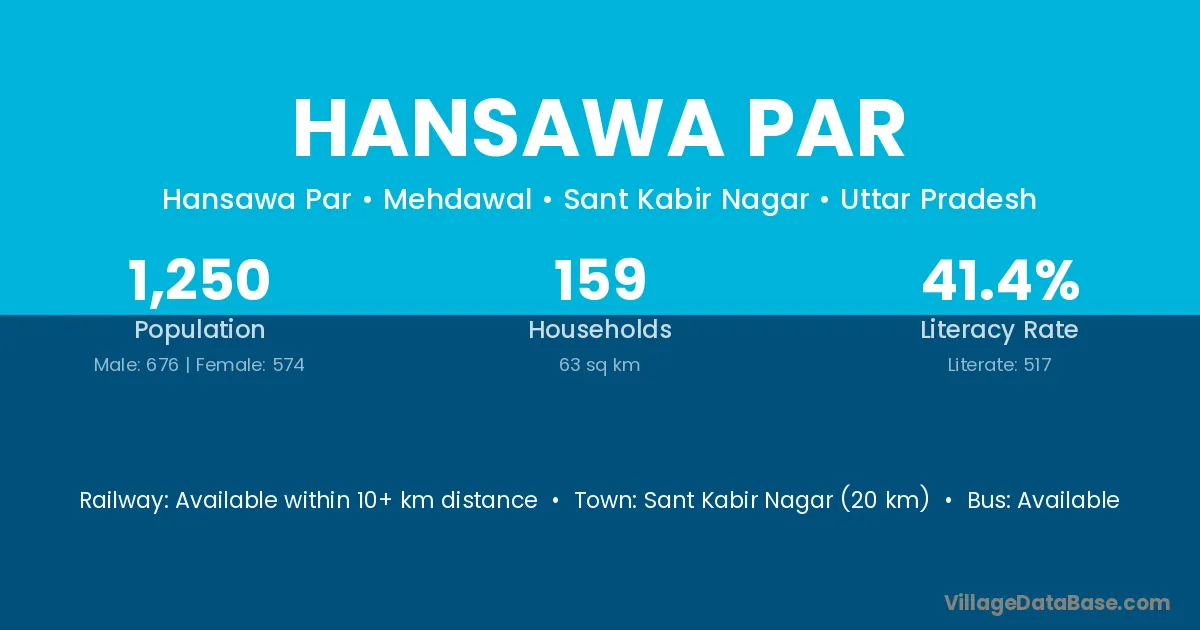 Sant Kabir Nagar (20 km) is the nearest town to Hansawa Par village for major economic activities and is located approximately 20 km away.