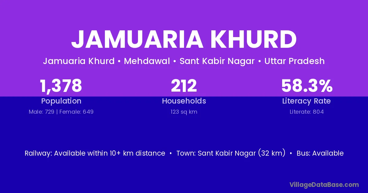 Sant Kabir Nagar (32 km) is the nearest town to Jamuaria Khurd village for major economic activities and is located approximately 32 km away.