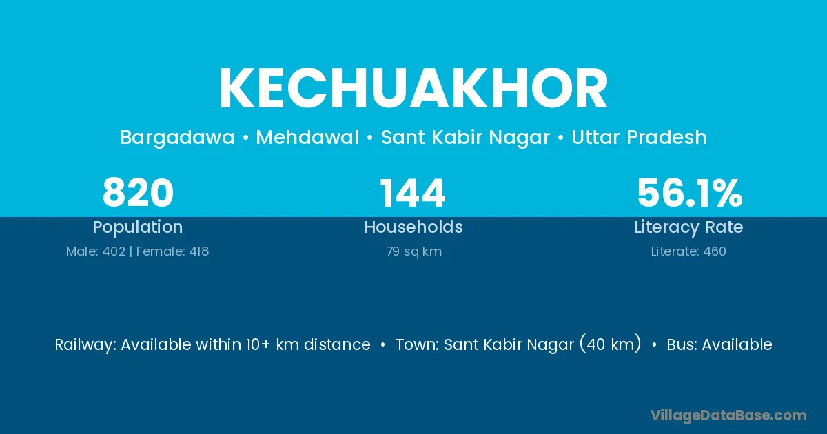 Sant Kabir Nagar (40 km) is the nearest town to Kechuakhor village for major economic activities and is located approximately 40 km away.