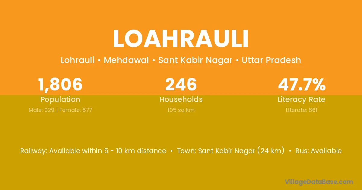 Sant Kabir Nagar (24 km) is the nearest town to Loahrauli village for major economic activities and is located approximately 24 km away.