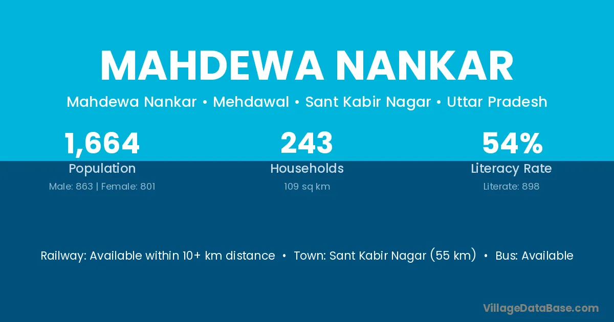 Sant Kabir Nagar (55 km) is the nearest town to Mahdewa Nankar village for major economic activities and is located approximately 55 km away.