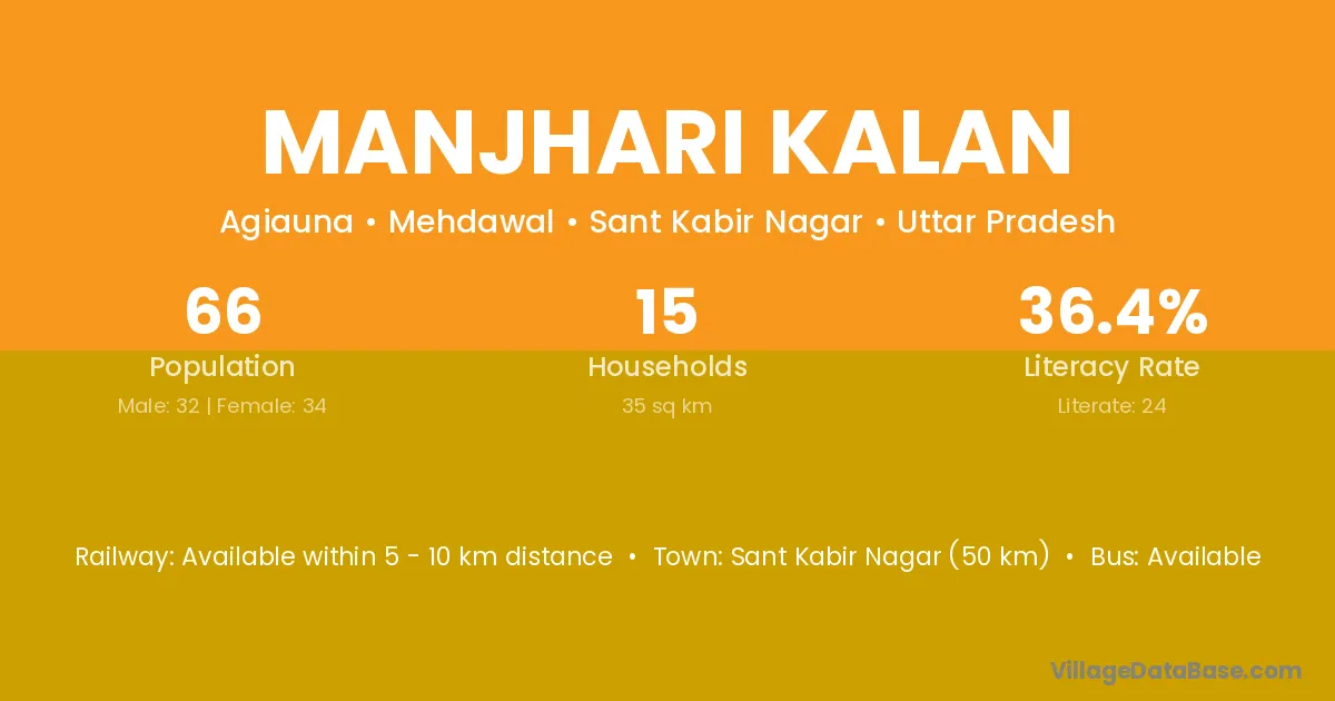 Sant Kabir Nagar (50 km) is the nearest town to Manjhari Kalan village for major economic activities and is located approximately 50 km away.