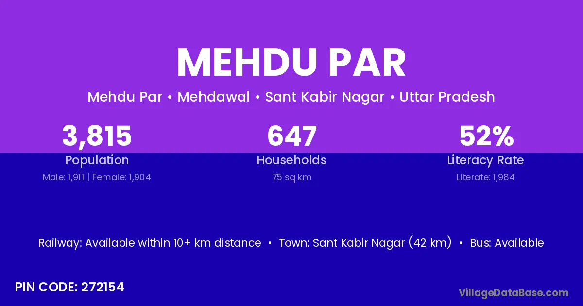 Sant Kabir Nagar (42 km) is the nearest town to Mehdu Par village for major economic activities and is located approximately 42 km away.