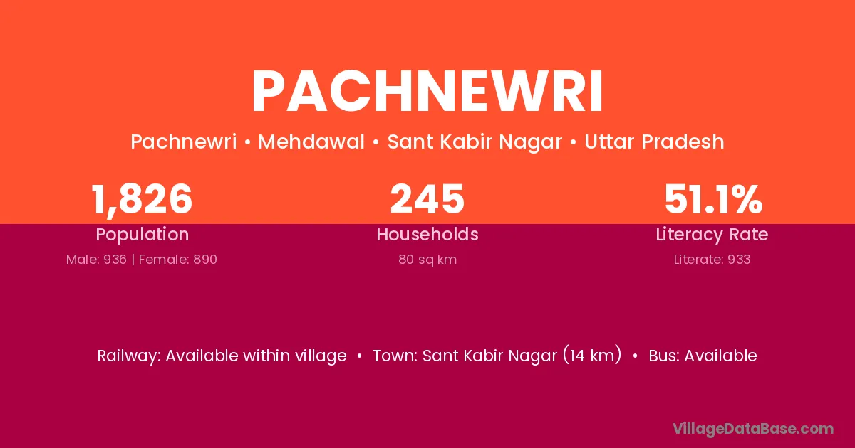 Sant Kabir Nagar (14 km) is the nearest town to Pachnewri village for major economic activities and is located approximately 14 km away.