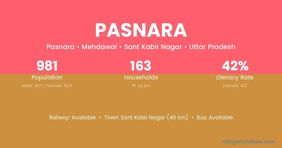 Sant Kabir Nagar (40 km) is the nearest town to Pasnara village for major economic activities and is located approximately 40 km away.