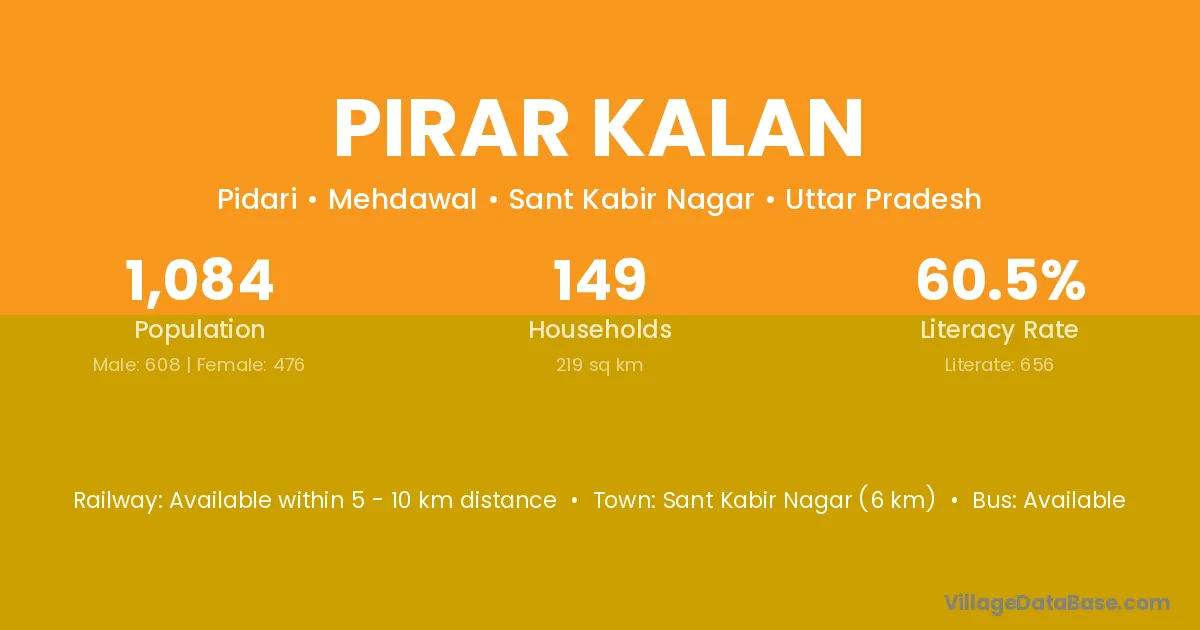 Sant Kabir Nagar (6 km) is the nearest town to Pirar Kalan village for major economic activities and is located approximately 6 km away.