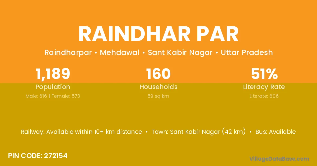 Sant Kabir Nagar (42 km) is the nearest town to Raindhar Par village for major economic activities and is located approximately 42 km away.