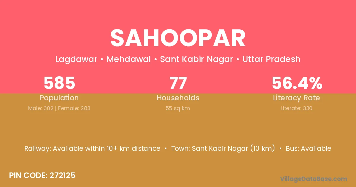 Sant Kabir Nagar (10 km) is the nearest town to Sahoopar village for major economic activities and is located approximately 10 km away.
