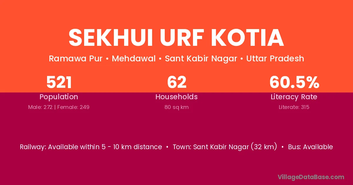 Sant Kabir Nagar (32 km) is the nearest town to Sekhui Urf Kotia village for major economic activities and is located approximately 32 km away.