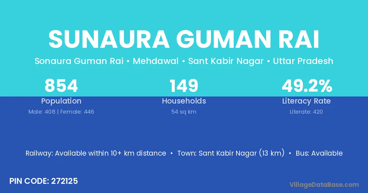 Sant Kabir Nagar (13 km) is the nearest town to Sunaura Guman Rai village for major economic activities and is located approximately 13 km away.