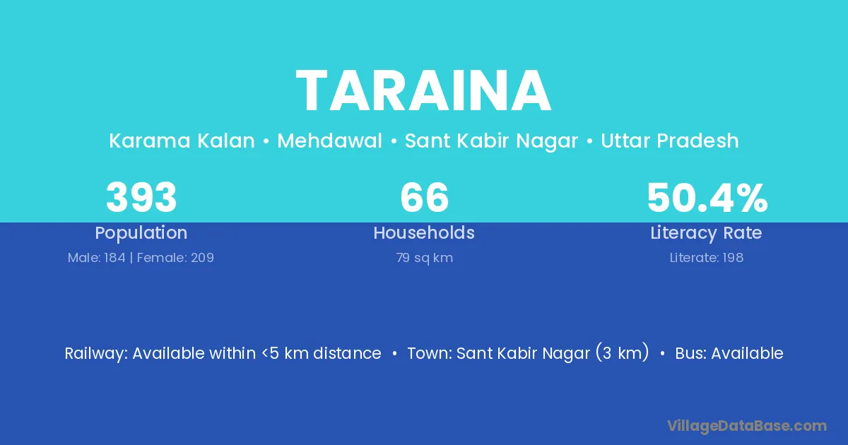 Sant Kabir Nagar (3 km) is the nearest town to Taraina village for major economic activities and is located approximately 3 km away.