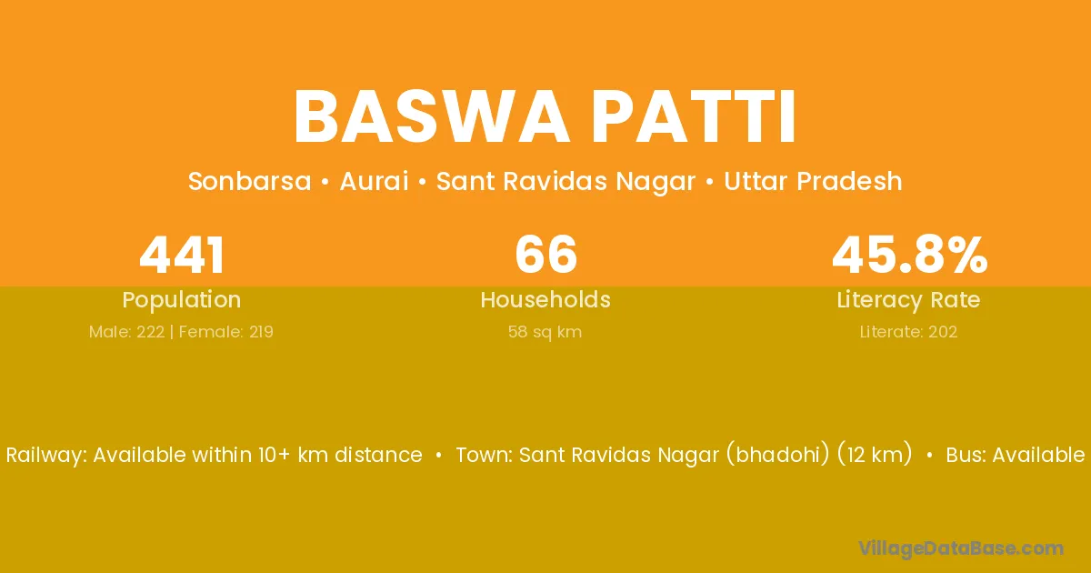 Sant Ravidas Nagar (bhadohi) (12 km) is the nearest town to Baswa Patti village for major economic activities and is located approximately 12 km away.