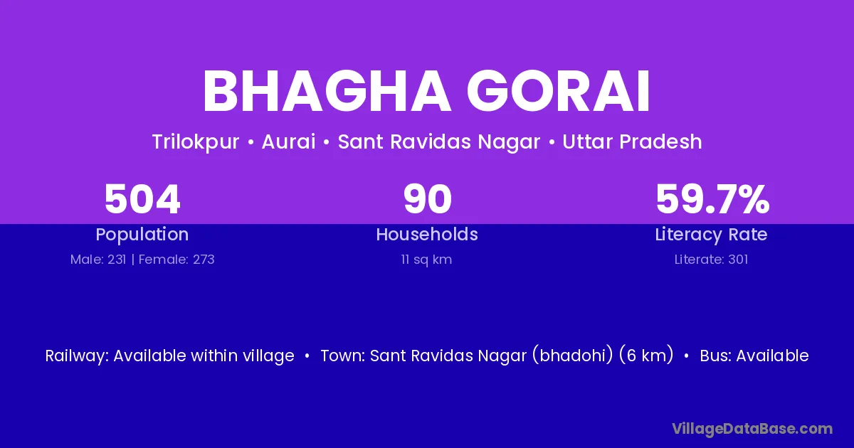 Sant Ravidas Nagar (bhadohi) (6 km) is the nearest town to Bhagha Gorai village for major economic activities and is located approximately 6 km away.