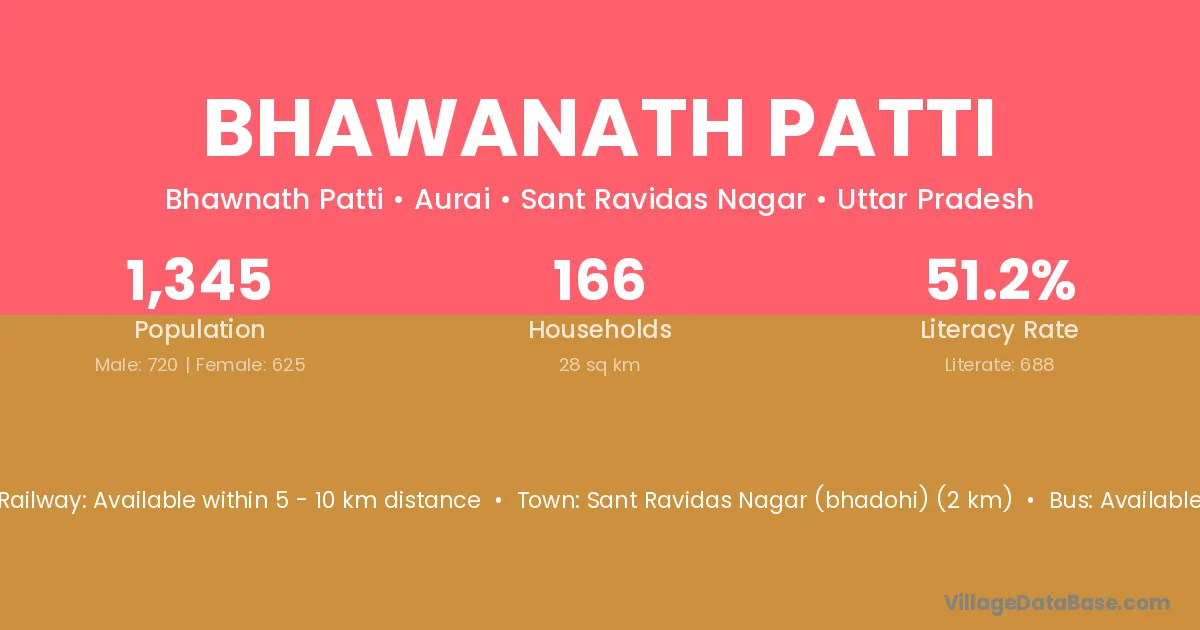 Sant Ravidas Nagar (bhadohi) (2 km) is the nearest town to Bhawanath Patti village for major economic activities and is located approximately 2 km away.
