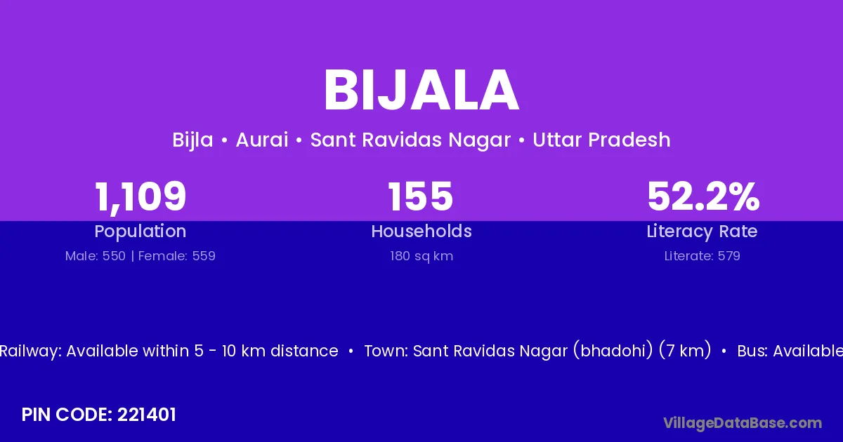 Sant Ravidas Nagar (bhadohi) (7 km) is the nearest town to Bijala village for major economic activities and is located approximately 7 km away.