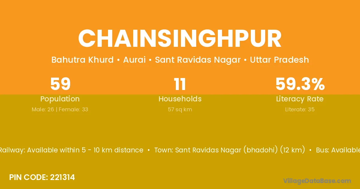 Sant Ravidas Nagar (bhadohi) (12 km) is the nearest town to Chainsinghpur village for major economic activities and is located approximately 12 km away.