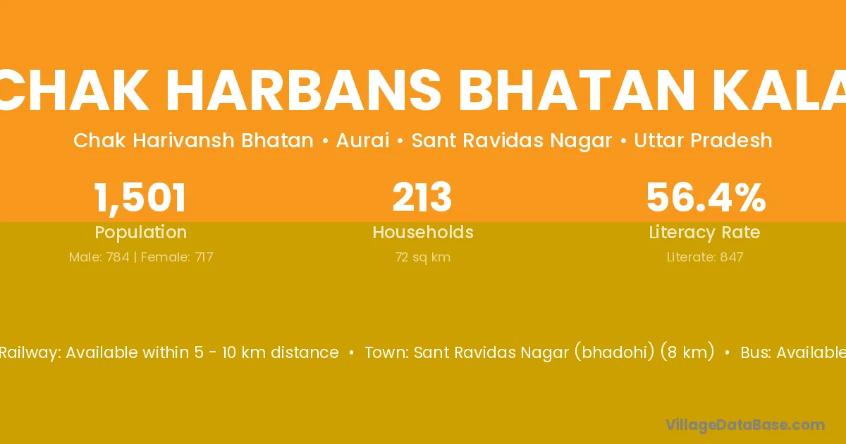 Sant Ravidas Nagar (bhadohi) (8 km) is the nearest town to Chak Harbans Bhatan Kala village for major economic activities and is located approximately 8 km away.