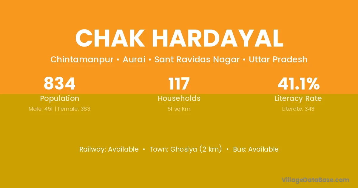 Chak Hardayal village has a total population of 834 people, of which 451 are males and 383 are females.