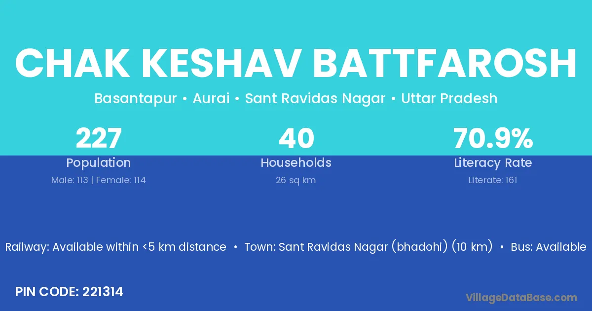 Chak Keshav Battfarosh village has a total population of 227 people, of which 113 are males and 114 are females.