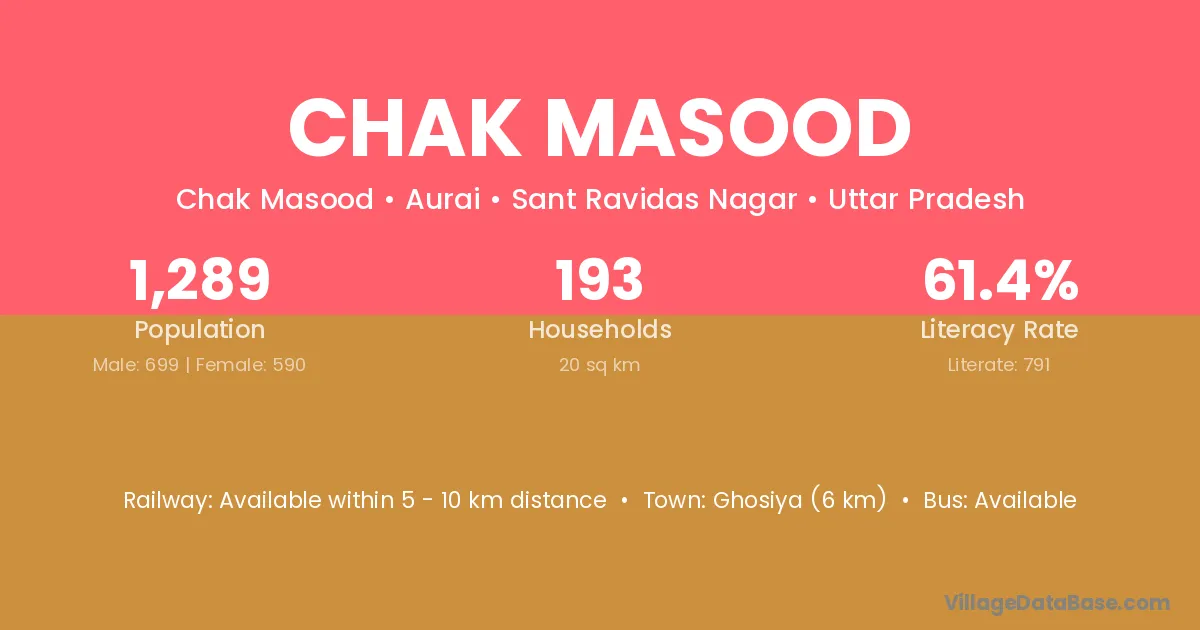 Ghosiya (6 km) is the nearest town to Chak Masood village for major economic activities and is located approximately 6 km away.
