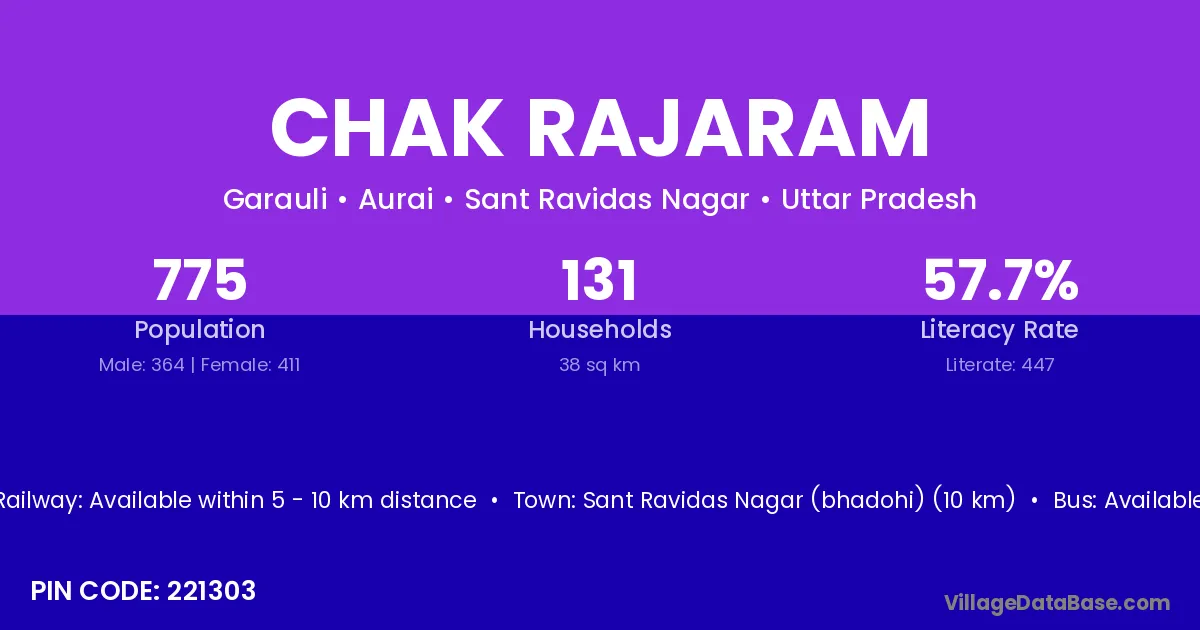 Sant Ravidas Nagar (bhadohi) (10 km) is the nearest town to Chak Rajaram village for major economic activities and is located approximately 10 km away.