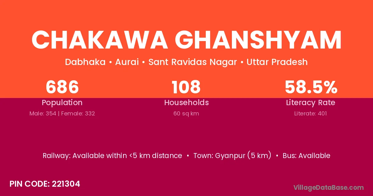 Gyanpur (5 km) is the nearest town to Chakawa Ghanshyam village for major economic activities and is located approximately 5 km away.