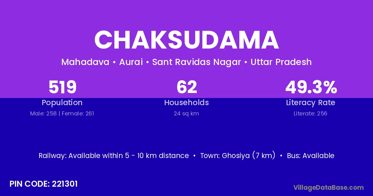 Chaksudama village has a total population of 519 people, of which 258 are males and 261 are females.