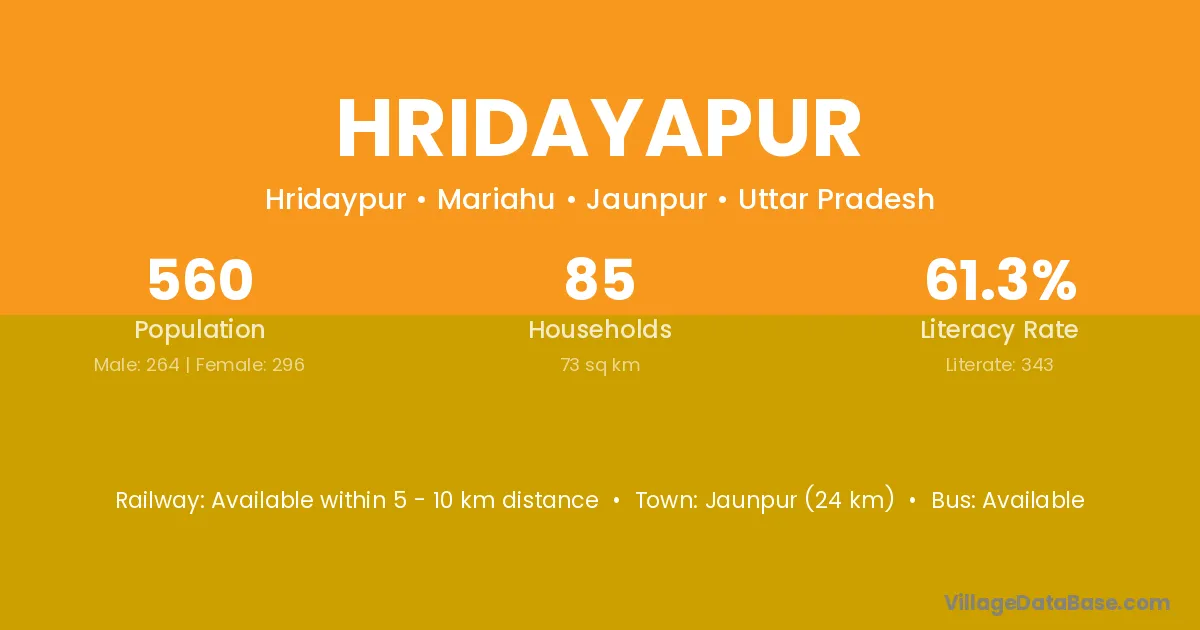Hridayapur village has a total population of 201 people, of which 112 are males and 89 are females.